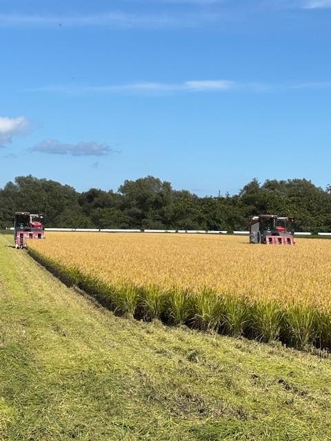 200m超えの田んぼに2台のコンバインが出動。