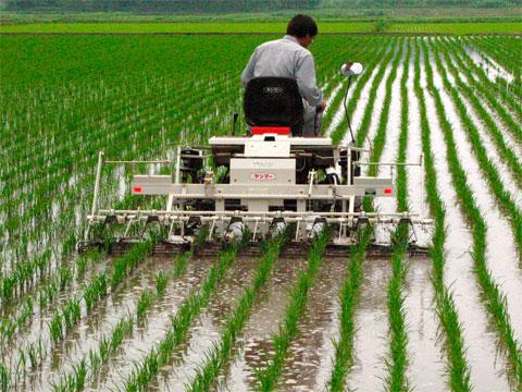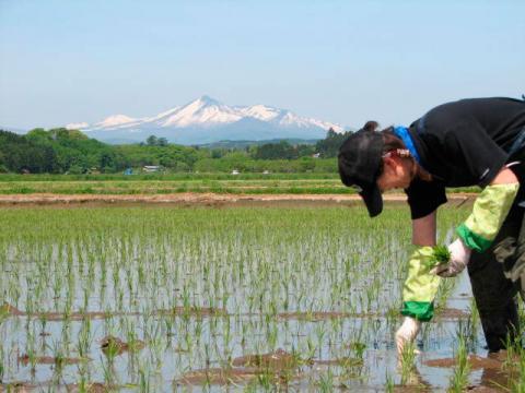 機械による植え付けも終わり、早乙女が部分的補植をしてる場面です。