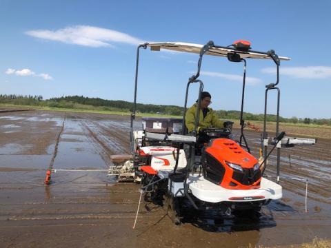 いよいよ田んぼには種まきです。Aさん機械に乗って楽しく作業をしています。